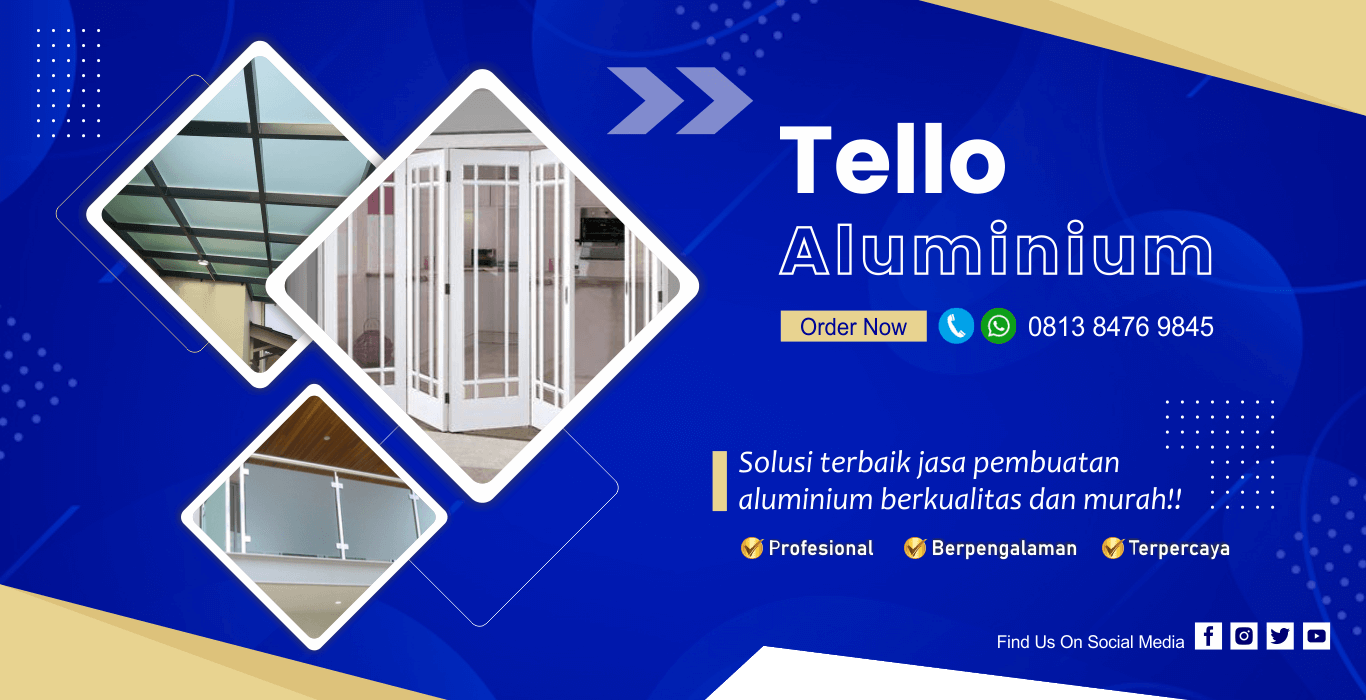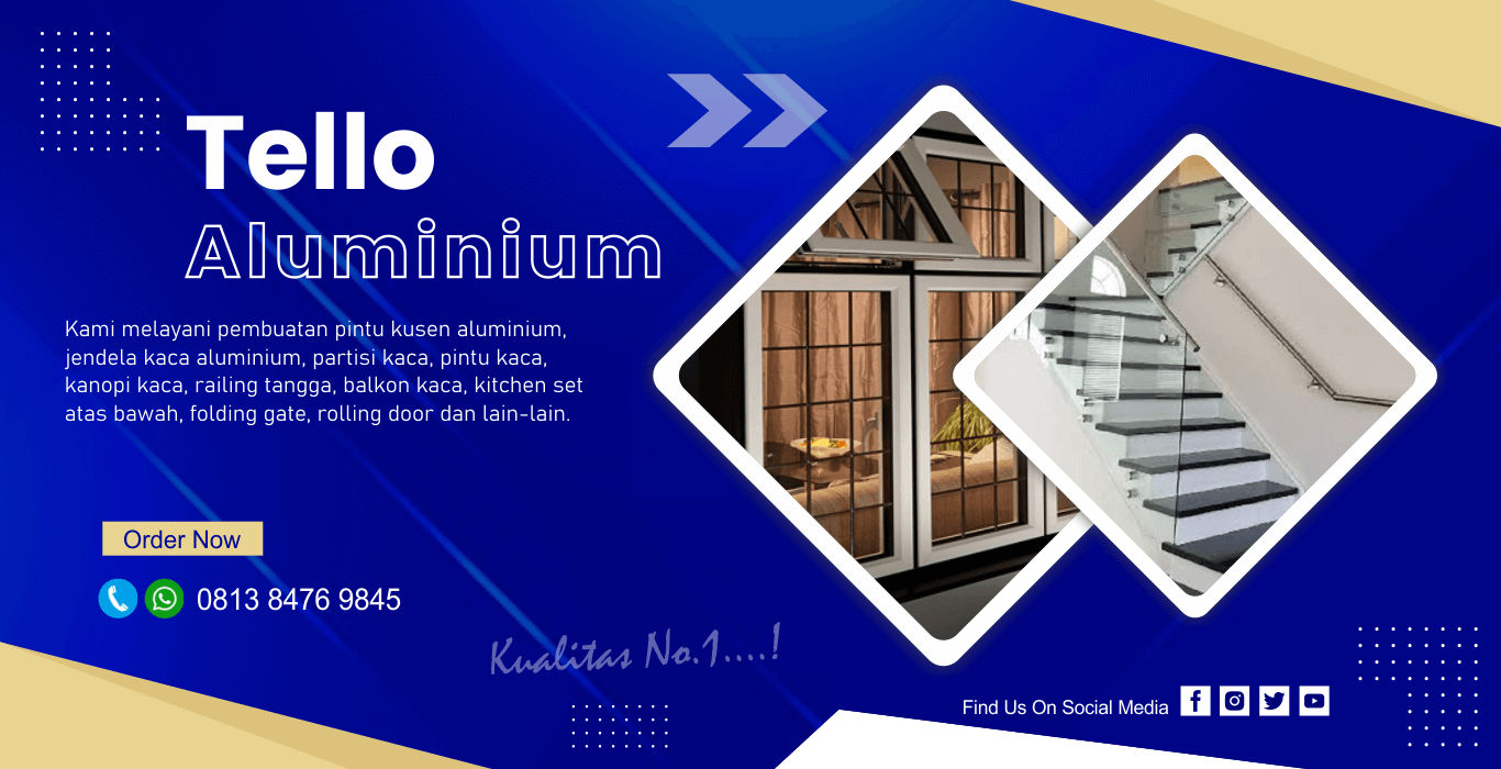 Tello Aluminium merupakan Spesialis Jual Kusen Aluminium Alexindo Terlengkap dan Termurah di Tangerang. Kami melayani jual pintu aluminium, jual kanopi kaca aluminium, jual pintu kaca aluminium, jendela kaca aluminium, partisi kaca, railing tangga, balkon kaca, kitchen set, folding gate, rolling door dan lain sebagainya. Kami siap menjadi pilihan bagi Anda yang sedang mencari spesialis pembuatan produk aluminium dengan harga termurah.